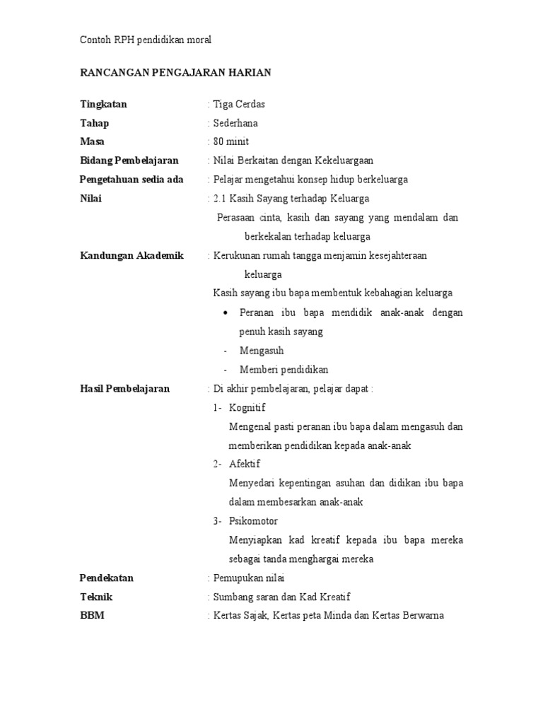 RPH BI Sejarah Pendidikan Moral RPH Pendidikan Sivik. Dalam usaha menjadikan diri seorang guru yang efektif dan proaktif guru perlulah menyediakan rancangan pengajaran. Antara perkara yang mesti dilakukan oleh seseorang yang bergelar guru pada setiap hari adalah pastinya menyediakan rancangan pengajaran harian.